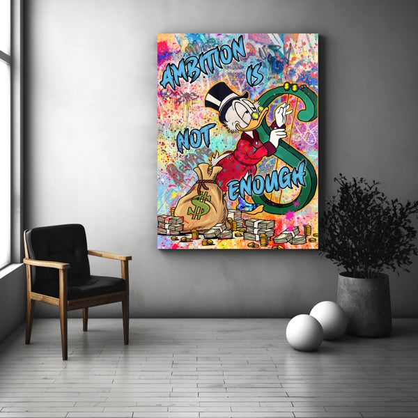 Tauche ein in die bunte Welt der Pop Art mit diesem farbenfrohen Bild auf Leinwand und Acrylglas! Vor einem lebhaften Pop Art Hintergrund zeigt sich der legendäre Comic-Geizhals in einem stylischen Designer-Hausmantel und Zylinder. Er spielt lässig an einer Harfe in Form einer Dollar Note. Vor ihm liegen Dollarnoten und ein Geldsack – eine kraftvolle Darstellung des Mottos "Ehrgeiz ist nicht genug". Durch das Hinzufügen eines hochwertigen Rahmens wird das außergewöhnliche Ambiente deines Raumes und die einzigartige Ausstrahlung des Bildes zusätzlich verstärkt. Perfekt für alle, die etwas Spezielles und Ausgefallenes suchen. Bestelle jetzt und bringe dieses einzigartige Kunstwerk in dein Zuhause! Wir freuen uns auf deine Bestellung und viel Spaß beim Shoppen!