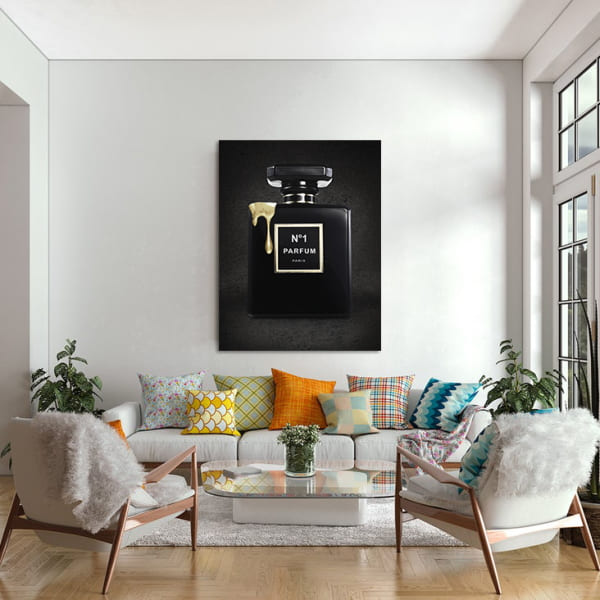 Wer Parfum und Kunst liebt, wird mit diesem Bild nichts falsch machen. In dezenten Schwarztönen gehalten und etwas Gold verfeinert, macht das Bild garantiert etwas her. Die Liebe zum Detail wird aufgrund der kleinen goldfarbenen Fläche deutlich. Ein modernes und schönes Bild, welches in jeden Wohnraum passt und die Liebe zu Parfüm und dezenten Farben deutlich macht.