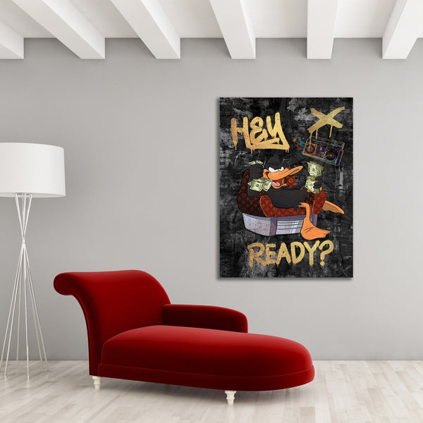 Hey Du! Du bist ein Fan von Comics und Kunst? Dann haben wir das perfekte Wandbild für dich! Unser Wandbild auf Leinwand und Acrylglas zeigt eine berühmte schwarze Comic-Ente mit Dollarnoten und dem Schriftzug "Hey ready". Diese coole und trendige Darstellung wird garantiert zum Blickfang in deinem Zimmer oder Büro. Es passt perfekt an jede Wand und erinnert dich daran, immer bereit zu sein. Auch wartest du noch? Hol dir jetzt dieses einzigartige Kunstwerk und bringe Style in deine Räume! Klicke jetzt auf den Button und bestelle dein Wandbild!