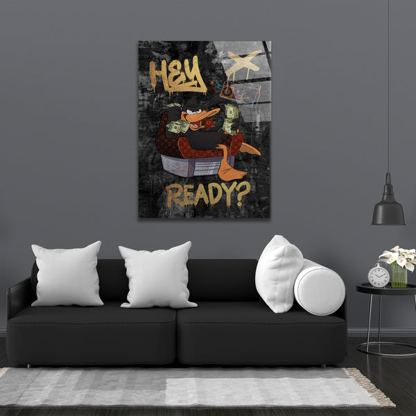 Hey Du! Du bist ein Fan von Comics und Kunst? Dann haben wir das perfekte Wandbild für dich! Unser Wandbild auf Leinwand und Acrylglas zeigt eine berühmte schwarze Comic-Ente mit Dollarnoten und dem Schriftzug "Hey ready". Diese coole und trendige Darstellung wird garantiert zum Blickfang in deinem Zimmer oder Büro. Es passt perfekt an jede Wand und erinnert dich daran, immer bereit zu sein. Auch wartest du noch? Hol dir jetzt dieses einzigartige Kunstwerk und bringe Style in deine Räume! Klicke jetzt auf den Button und bestelle dein Wandbild!