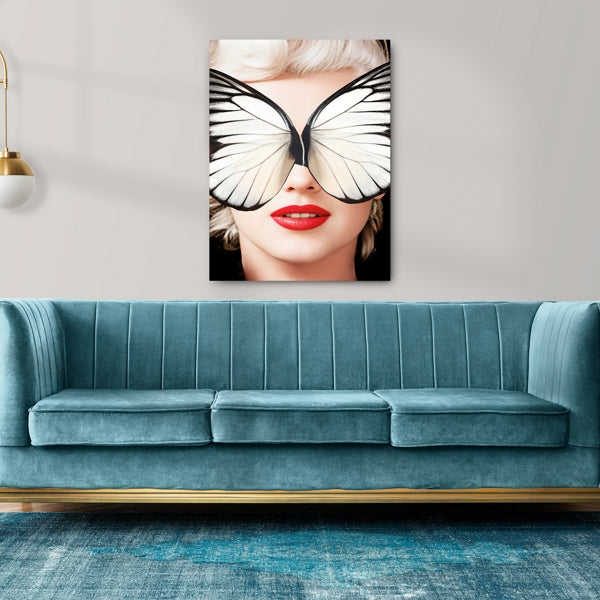 Entdecken Sie die zeitlose Eleganz unseres Wandbildes auf Leinwand und Acrylglas – eine faszinierende Verschmelzung von Kunst und Raffinesse. Das Bild präsentiert das Gesicht einer blonden Schönheit, betont durch knallroten Lippenstift, auf einem tiefen schwarzen Hintergrund. Über ihren Augen schweben anmutige, schwarz-weiße Schmetterlingsflügel, die eine subtile Symbolik der Verwandlung vermitteln. Optional mit hochwertigem Rahmen erhältlich, verleiht dieses Kunstwerk jedem Raum eine exklusive Note. Schaffen Sie eine Aura der Eleganz und erwecken Sie Ihre Wände zum Leben. Verleihen Sie Ihrem Raum einen Hauch von Glamour – bestellen Sie jetzt! Wir freuen uns auf deine Bestellung und viel Spaß beim Shoppen!