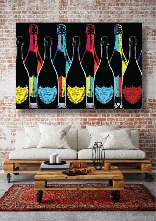 Wer Champagner liebt und ein modernes und zugleich dezentes Bild für die eigenen vier Wände sucht, wird mit diesem Wandbild garantiert nichts falsch machen. Auf einem dunklen Hintergrund kommen die bunten Champagnerflaschen besonders gut zur Geltung und geben dem Wohnraum ein modernes Highlight. Wer zusätzlich farbliche Akzente setzen möchte, kann genau das mit diesem Bild erreichen.