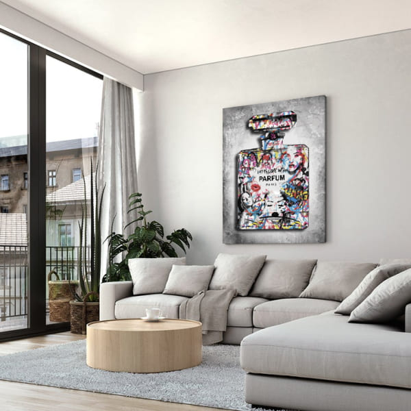 Pop-Art Wandbild mit Parfumflakon und bunten Gesichtern berühmter Persönlichkeiten sowie dem Slogan "I am in Love with Parfum".