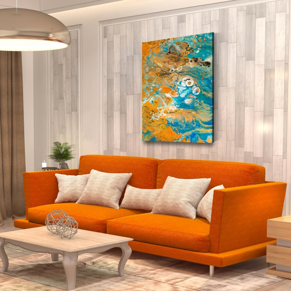 Tauchen Sie ein in die faszinierende Welt der Farben mit diesem ausdrucksstarken abstrakten Kunstwerk! Auf Leinwand und Acrylglas zeigt das Bild harmonisch ineinander verlaufende Orange-, Türkis-, Blau- und Brauntöne. Die kraftvollen Farben und die anziehende Ausstrahlung machen es zu einem echten Blickfang in jedem Raum. Durch das Hinzufügen eines hochwertigen Rahmens wird das Ambiente des Raumes noch mehr hervorgehoben und die Wirkung des Bildes verstärkt. Für alle, die sich gerne von einem intensiven Farbspiel verzaubern lassen. Bestellen Sie jetzt und bringen Sie künstlerische Magie in Ihr Zuhause. Bestelle jetzt und lass dich inspirieren! Wir freuen uns auf deine Bestellung und viel Spaß beim Shoppen.