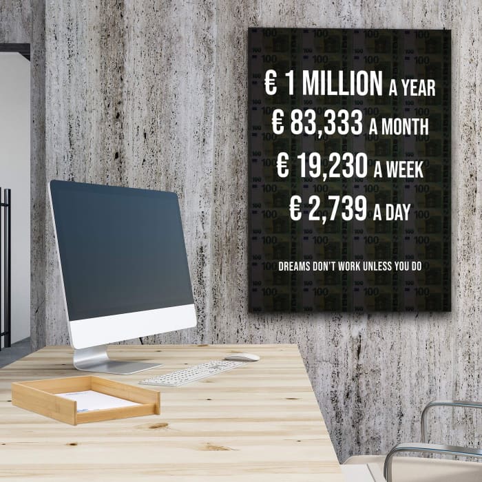 Jeder hat Träume und Ziele, die er gerne erreichen möchte. Vielleicht auch finanzielle Ziele? Ziele, die man am Tag, in der Woche, im Monat oder im Jahr erreichen will? Mit diesem Motivationsbild wird man immer wieder an seine gesetzten Ziele erinnert. Ein klasse Bild für das Büro oder Wohnräume, in denen man sich oft aufhält.