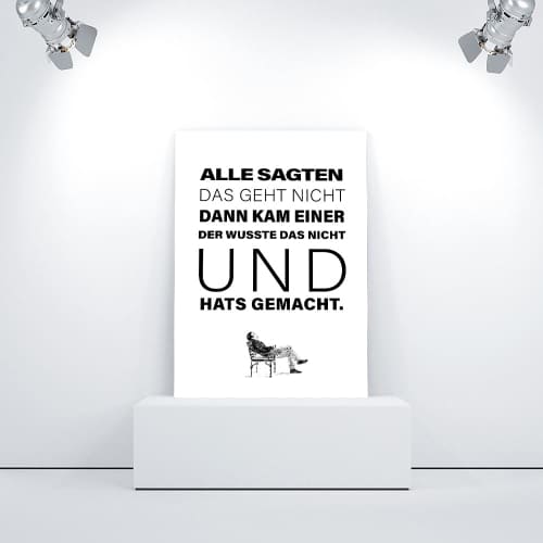Wie oft hört man von einem anderen Menschen „das geht nicht“? Sehr häufig. Doch dieser Spruch hat keine große Bedeutung, denn irgendwann gibt es immer einen Menschen, der es dann einfach macht und schafft. Genau das soll dieses Wandbild vermitteln. In schwarzer Schrift auf weißem Hintergrund sieht es nicht nur modern, sondern auch schlicht und dezent aus. Es passt somit in jeden Wohnraum.