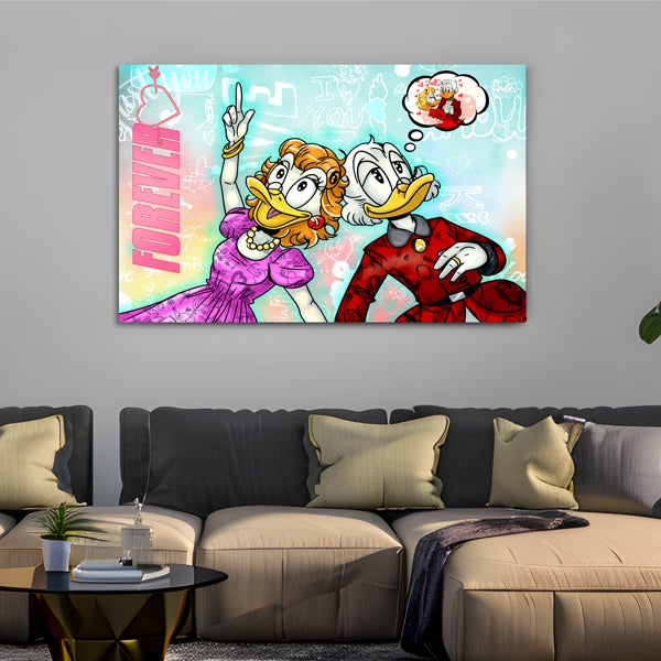 Lass Dich verzaubern von der sanften Welt der Pop Art mit diesem einzigartigen Bild auf Leinwand und Acrylglas! Vor einem Hintergrund in dezenten Pastellfarben zeigt sich der legendäre Comic-Geizhals im stylischen Designer-Mantel, verliebt an der Seite einer unbekannten Entenschönheit. Ihre verträumten Blicke und der Graffiti-Schriftzug "Forever" im Hintergrund versprühen Romantik pur. Die dezenteren Farben dieses Kunstwerks bringen Ruhe und Harmonie in jeden Raum. Durch das Hinzufügen eines hochwertigen Rahmens wird das stimmungsvolle Ambiente und die zarte Ausstrahlung des Bildes zusätzlich verstärkt. Ideal für alle, die das Besondere und Ausgefallene lieben. Bestelle jetzt und bereichere dein Zuhause mit dieser romantischen Kunst! Wir freuen uns auf deine Bestellung und viel Spaß beim Shoppen!
