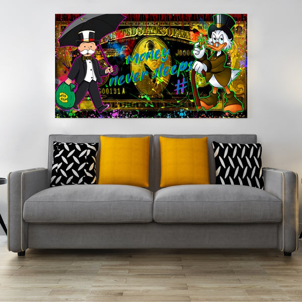 Spüren Sie die Exklusivität und Einzigartigkeit unseres Kunstwerks aus der Limited Edition – eine wahre Kostbarkeit auf Leinwand und Acrylglas. Diese fesselnde Komposition zeigt zwei ikonische Figuren in einem faszinnierenden Zusammenspiel. Die legendäre Comic-Ente mit ihrem unverkennbaren Zylinder und Spazierstock, die stolz einen funkelnden Goldtaler in der Hand trägt. Neben ihr das bekannte Maskottchen eines populären Brettspiels im schwarzen Smoking mit einem eleganten schwarzen Regenschirm und einem grünen Geldsack. Lassen Sie sich verzaubern von der Welt der Kunst mit diesem Meisterwerk im farbenfrohen Popart Design. Diese Edition ist auf nur 100 Exemplare limitiert. Jedes Kunstwerk wird begleitet von einem exklusiven Zertifikat, das auf Ihren Namen ausgestellt ist und mit einer einzigartigen Nummer versehen wurde. Verleihen Sie Ihrem Raum einen Hauch von Luxus und Individualität – sichern Sie sich jetzt Ihr limitiertes Kunstwerk und werden Sie Teil dieser exklusiven Kunstbewegung! Bestellen Sie noch heute und erleben Sie die Einzigartigkeit, die nur begrenzte Stückzahlen bieten können.