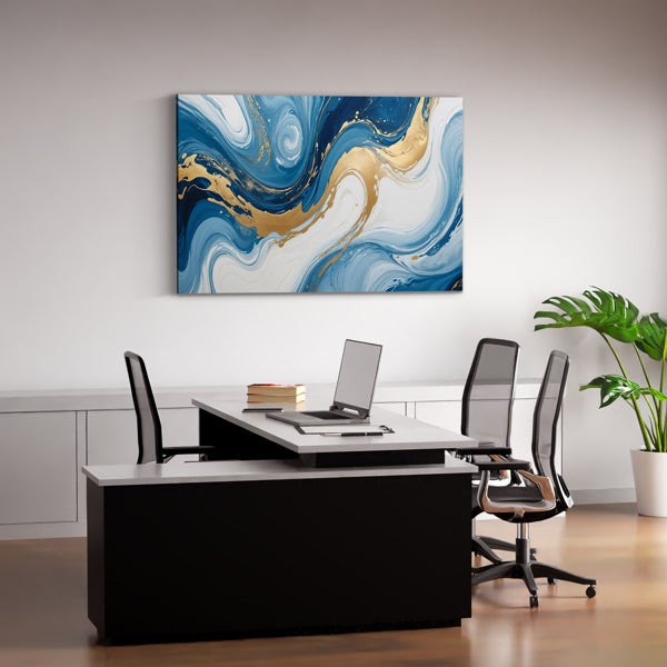 Dieses ausdrucksstarke Kunstwerk auf Leinwand und Acrylglas begeistert mit kräftigen Türkis-, Blau- und Weißtönen, die durch goldene Akzente veredelt werden. Die kraftvollen Farben und die starke Ausstrahlung machen das Bild zu einem echten Blickfang in jedem Raum. Durch das Hinzufügen eines hochwertigen Rahmens wird das einzigartige Ambiente des Raumes und die strahlende Wirkung des Bildes zusätzlich verstärkt. Für alle, die sich gerne von einem lebhaften Farbspiel verzaubern lassen und Kunst als Ausdruck ihrer Persönlichkeit schätzen. Hol dir dieses außergewöhnliche Kunstwerk jetzt nach Hause und erschaffe deine eigene Galerie! Wir freuen uns auf Deine Bestellung!