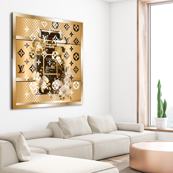 Setze ein luxuriöses Statement mit diesem exklusiven Kunstwerk auf Leinwand oder Acrylglas! Im quadratischen Format präsentiert sich eine ikonische Parfümflasche, kunstvoll umrankt von eleganten Blüten. Der edle goldene Hintergrund verleiht dem Bild eine glamouröse Ausstrahlung, während die dezent verteilten Initialen eines namhaften Luxusdesigners den exklusiven Charakter unterstreichen. Ein echtes Highlight für stilbewusste Trendsetter, die ihr Ambiente auf das nächste Level heben wollen. Ob mit oder ohne hochwertigen Rahmen – dieses Kunstwerk bringt Glanz und Eleganz in jeden Raum. Gönn dir Luxus für deine Wände und hol dir dein exklusives Designstück nach Hause! Bestelle jetzt und bringe stylischen Chic und Pop Art Eleganz in dein Zuhause! Wir freuen uns auf deine Bestellung und viel Spaß beim Shoppen!