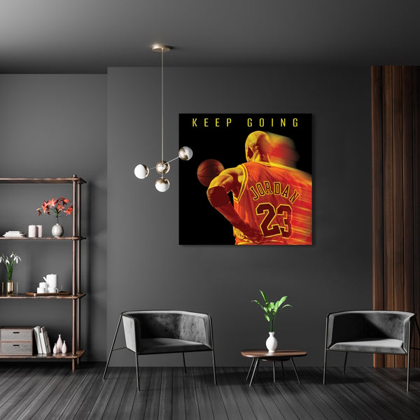 Hol dir dieses epische Wandbild für deinen Raum! Auf einem coolen schwarzen Hintergrund siehst du einen der absolut besten Basketballspieler aller Zeiten im orangefarbenen Dress mit seiner legendären Trikotnummer 23. Er ist in Aktion, der Basketball schwebt vor ihm, und darüber prangt der motivierende Schriftzug "Keep Going". Das ist die perfekte Dekoration für alle Basketball-Fans und motivierte Sportler. Zeig deine Leidenschaft und hol dir diesen Blickfang! Mach dein Zimmer zum Place-to-Be für Fans und Sportbegeisterte. Beeindrucke deine Freunde und erinnere dich jeden Tag daran, stets weiterzumachen. Bestell jetzt und hol dir deine tägliche Dosis Inspiration! Keep Going! Wir freuen uns auf deine Bestellung und viel Spaß beim Shoppen.