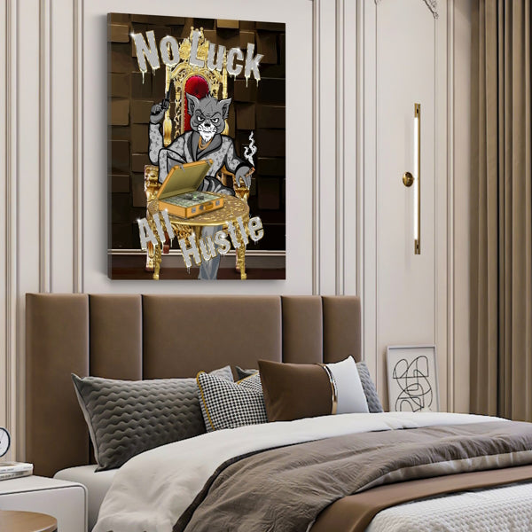 Treten Sie ein in die exklusive Welt der Kunst voller Kreativität und Einzigartigkeit. Das Meisterwerk aus unserer Limited Edition präsentiert eine majestätische, bedrohlich blickende Katze in einem glänzenden Designer-Hausmantel auf einem königlichen Thron. Mit einer Hand, die eine Pistole hält und der anderen, die eine qualmende Zigarre geschickt balanciert, strahlt sie Charisma und Selbstbewusstsein aus. Ein offener Geldkoffer voller Banknoten auf einem goldenen Tisch vervollständigt das glanzvolle Bild von Reichtum und Erfolg. Verleihen Sie diesem Kunstwerk mit einem hochwertigen Rahmen noch mehr Pracht und Eleganz für eine besonders stilvolle Präsentation. Diese exklusive Edition ist auf 100 Stück begrenzt und wird durch ein Zertifikat mit Ihrem Namen und einer einzigartigen Nummer gekrönt. Nehmen Sie Platz in dieser königlichen Kunstwelt und holen Sie sich Ihr eigenes Meisterwerk!