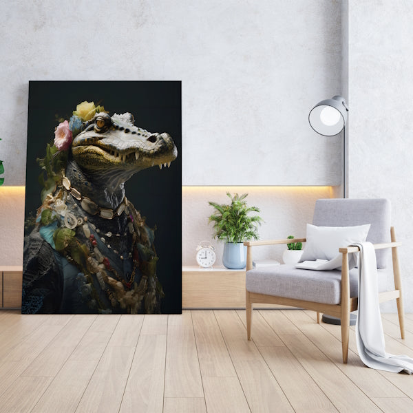 Werk-Beschreibung: Verleihen Sie Ihren Räumen eine exotische Note mit unserem einzigartigen Wandbild auf Leinwand und Acrylglas. Das faszinierende Kunstwerk des renommierten Künstlers Juliano Santos de Araújo zeigt einen prächtigen Alligator, mit opulentem Schmuck behangen und umgeben von üppigen floralen Motiven. Die Kombination aus Leinwand und Acrylglas verleiht dem Bild eine außergewöhnliche Tiefenwirkung und Brillanz. Tauchen Sie ein in die Welt der Eleganz und Naturschönheit. Bringen Sie dieses meisterhafte Kunstwerk in Ihr Zuhause und lassen Sie sich von der Faszination der Wildnis verzaubern. Erwecken Sie Ihre Wände zum Leben – jetzt neu in unserem Shop! Wir freuen uns auf deine Bestellung und viel Spaß beim shoppen.