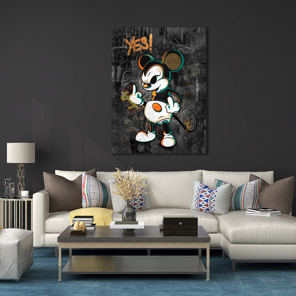 Tauchen Sie ein in die aufregende Welt der Pop Art mit unserem einzigartigen Wandbild auf Leinwand und Acrylglas! Inspiriert von Platons Zeichengebung, präsentieren wir Ihnen eine provokante Interpretation. Vor einem mysteriösen dunklen Hintergrund findest du die weltberühmte Comic-Maus, die mit verärgertem Gesichtsausdruck in Pose tritt. Über ihrem Kopf steht das klare Statement: „YES!“ - ein Ausruf der Selbstbestimmung. Um sie herum ranken sich Graffitis, die nur eine Botschaft vermitteln: „Lass mich besser in Ruhe!“ Hol dir jetzt dieses beeindruckende Kunstwerk nach Hause und setze ein starkes Statement in deinem Raum. Bestelle noch heute und zeige der Welt, dass du deine eigene Philosophie lebst! Wir freuen uns auf deine Bestellung und viel Spaß beim Shoppen!