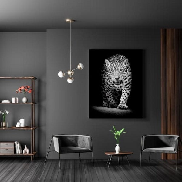 Elegant, einzigartig und stark – Eigenschaften, die ein Leopard widerspiegelt. Der Leopard gehört zu den Wildkatzen, beziehungsweise zu den Raubtieren und zeigt eine unfassbare Stärke. Auch dieses schwarz-weiß gehaltene Wandbild drückt die Stärke des Tieres aus. Ein sehr schönes Bild, welches zu jedem Wohnstil passt und Kraft und Stärke zum Ausdruck bringt.