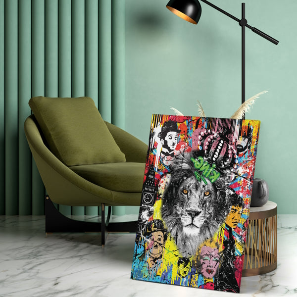 Willkommen in der bunten Welt der Kinolegenden! Unser exklusives Wandbild auf Leinwand und Acrylglas vereint einen königlichen Löwenkopf mit einer majestätischen Krone in der Mitte und umgibt ihn mit den ikonischsten Figuren aus der Filmwelt. Ein farbenfroher Hintergrund zieht die Blicke an, während ein „King“-Graffiti die rebellische Seite des Kinos repräsentiert. Dieses Kunstwerk ist perfekt für diejenigen, die Filmfanatiker sind und sich von der Masse abheben möchten. Es verleiht deinem Raum einen Hauch von Hollywood-Glanz und ist ein Gesprächsstoff für deine Freunde. Zeig deine Liebe für das Kino und hol dir jetzt dein einzigartiges Wandbild! Wir freuen uns auf deine Bestellung und viel Spaß beim Shoppen!