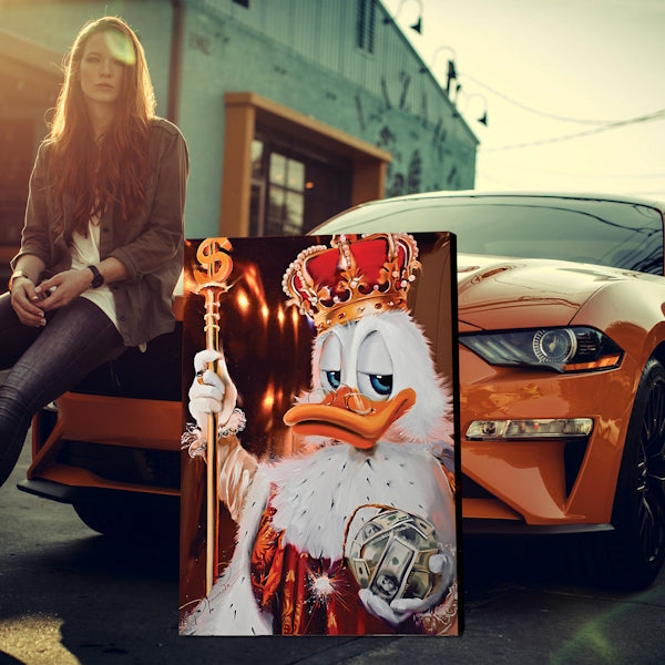Werk-Beschreibung: Verleihe deinem Raum einen Hauch von Pop Art und Erfolg mit unserem einzigartigen Wandbild auf Leinwand und Acrylglas. Tauche ein in die Welt des Stils und des Triumphs, während eine ikonische, königlich gekleidete Comic-Ente das Zentrum bildet. Mit Zepter in einer Hand, geschmückt mit Dollarzeichen, und dem Reichsapfel in der anderen, umgeben von Dollar-Noten, strahlt dieses Kunstwerk den Geist der richtigen Einstellung und des Erfolgs aus. Perfekt für diejenigen, die nach höherem Streben suchen. Setze ein Statement in deinem Raum und ermutige dich täglich, das Königreich des Erfolgs zu erobern! Hol es dir jetzt und regiere über deine Ziele. Wir freuen uns auf deine Bestellung und viel Spaß beim shoppen.