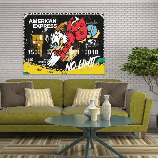 Hol Dir die pulsierende Welt der Pop Art mit unserem einzigartigen Werk! Das Bild auf Leinwand und Acrylglas zeigt den berühmten Comic-Geizhals im roten Designer-Hausmantel, der in ein Bad aus Goldtalern springt. Im Hintergrund prangt eine schwarze American Express Karte mit „No Limit“ Graffiti, das Motivation und Reichtum symbolisiert. Wählen Sie zwischen gerahmt und ungerahmt, um dieses Kunstwerk perfekt in Ihr exklusives Ambiente zu integrieren. Ein absolutes Must-Have für alle, die das Extravagante lieben! Bestelle jetzt und tauche ein in eine Welt voller Kunst und Luxus und denke immer daran: Nur Du selbst setzt Dir Grenzen!Wir freuen uns auf deine Bestellung und viel Spaß beim Shoppen!.