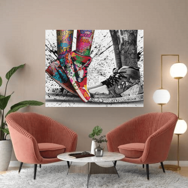 Pop Art und Schuhe miteinander kombiniert? Genau das kann dieses Wandbild bieten. Ein ausdrucksstarkes Bild in schwarz-weißer und bunter Farbe, welches Chucks-Liebhaber lieben werden. Ob in einem begehbaren Kleiderschrank, um Flur oder im Wohnzimmer – dieses Wandbild bringt einen besonderen Charakter mit in die eigenen vier Wänden und sorgt für einen echten Eyecatcher.