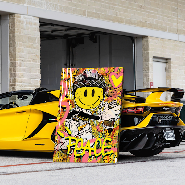 Werk-Beschreibung: Tauchen Sie ein in die pulsierende Welt der Pop Art mit unserem einzigartigen Wandbild auf Leinwand und Acrylglas. Dieses Kunstwerk vereint kraftvolle Elemente: Ein lächelnder Smiley, ausgestattet mit Helm und Sprühdosen, erstrahlt im urbanen Flair. Das Bild setzt ein kühnes Statement für Frieden mit einem farbenfrohen Graffiti, das das Wort „Peace“ kunstvoll darstellt, begleitet von einem lebendigen gelben Herzen. Eine Ode an Freude und Freiheit, die nicht nur Comic-Fans, sondern auch Kunst- und Graffiti-Enthusiasten anspricht. Bringen Sie mit diesem Kunstwerk fröhliche Energie und eine Botschaft der Harmonie in Ihre Räume. Holen Sie sich noch heute Ihr Stück urbanen Chic und Frieden! Wir freuen uns auf deine Bestellung und viel Spaß beim shoppen.