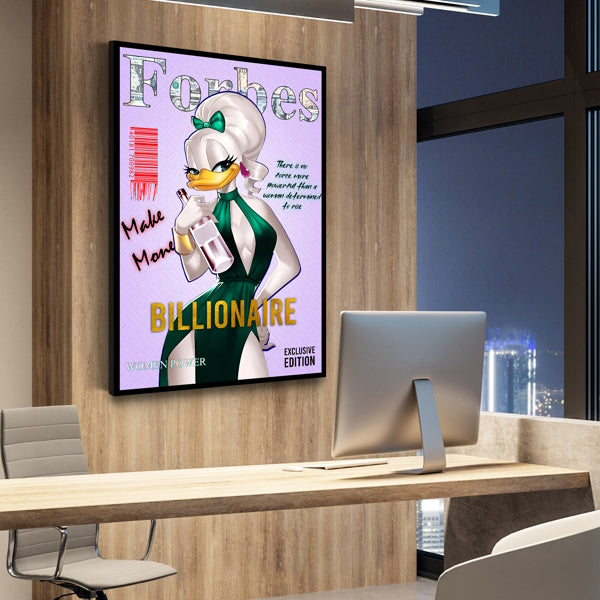 Entdecke das faszinierende Pop-Art Meisterwerk auf Leinwand und Acrylglas – ein visuelles Fest für moderne Ästhetik, erhältlich mit oder ohne Rahmen! Die weibliche Comic Ente, in einem atemberaubenden grünen Outfit auf dem Titelbild der "Forbes" mit einer verführerischen Satinschleife im aufwendig gestylten Haar, posiert mit aufreizendem Blick, in der Hand hält sie lässig eine Weinflasche. Das Kunstwerk trägt ein inspirierendes Statement von Bosa Sebele, einer leidenschaftlichen Aktivistin und Autorin aus Botswana, die alle starken Frauen ermutigt, ihren Weg zielstrebig zu gehen. Schaffe eine luxuriöse Atmosphäre in deinem Raum und betone den höheren Wert dieses Kunstwerks durch einen exklusiven Rahmen. Perfekt für alle, die das Besondere lieben. Hol dir jetzt dein Kunstwerk und bringe Glamour in deine Räume!.Diese exklusive Edition ist auf 100 Stück begrenzt und wird durch ein Zertifikat mit Ihrem Namen und einer einzigartigen Nummer gekrönt. Nehmen Sie Platz in dieser excuisiten Kunstwelt und holen Sie sich Ihr eigenes Meisterwerk!