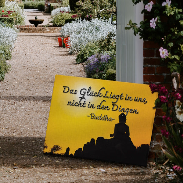 Entdecken Sie die Essenz der inneren Zufriedenheit mit unserem inspirierenden Motivationswandbild auf Leinwand und Acrylglas. Diese Kunstwerkskreation zeigt eine auf einem Berg sitzende schwarze Buddha-Silhouette vor einem strahlend gelben Hintergrund. Darüber erhebt sich die weise Botschaft von Buddha: „Such nicht das Glück in Dingen oder Sachen, sondern kreiere dir selbst Glücksmomente.“ Dieses einzigartige Kunstwerk erinnert Sie täglich daran, dass wahres Glück in Ihrem Inneren liegt. Lassen Sie diese beruhigende Präsenz in Ihr Zuhause einziehen und schaffen Sie eine Oase der Ruhe und Inspiration. Bereichern Sie Ihr Leben mit diesem Kunstwerk und lassen Sie sich von seiner Botschaft inspirieren. Klicken Sie jetzt, um Ihren eigenen Glücksmoment zu schaffen und dieses beeindruckende Motivationswandbild zu erwerben. Erwecken Sie Ihre innere Harmonie und Freude! Wir freuen uns auf deine Bestellung und viel Spaß beim shoppen.
